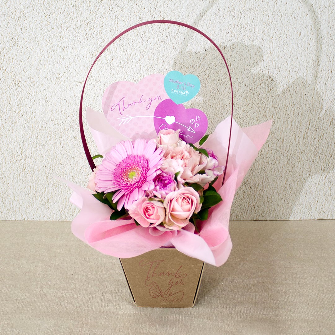 甘い雰囲気のピンクの花々をバッグにアレンジ。