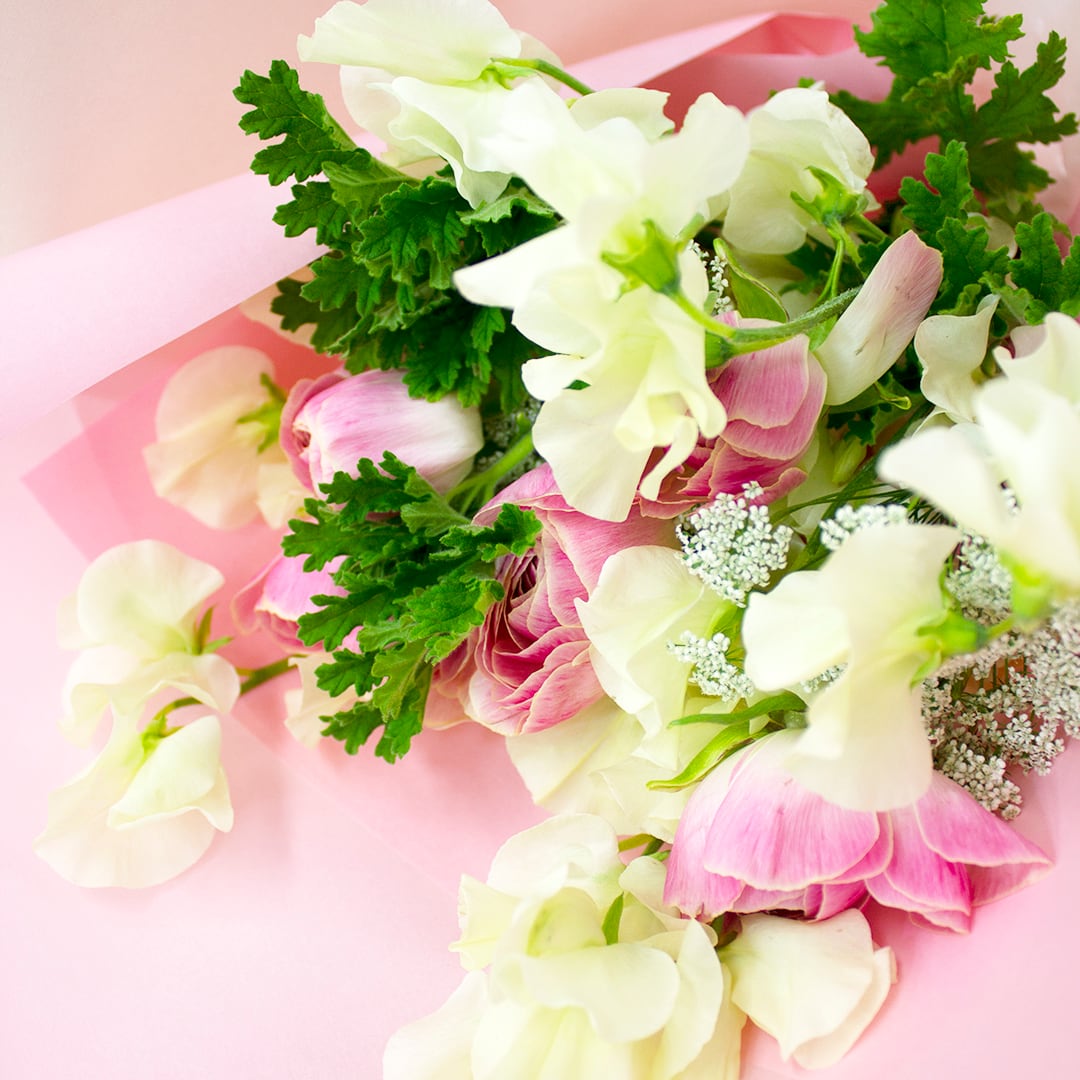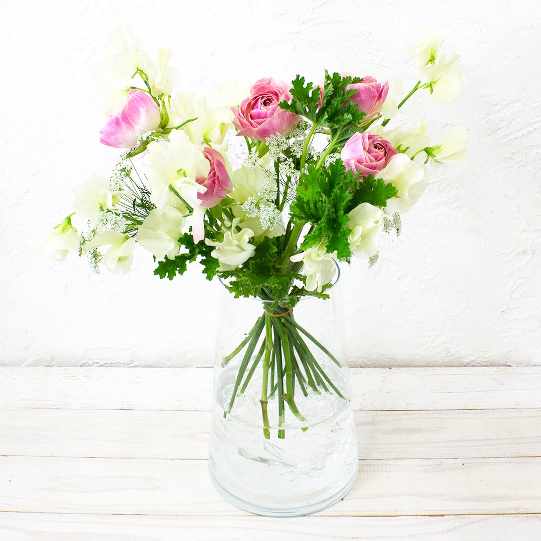 【花材例】 ラナンキュラス・レースフラワー・スイトピーなど